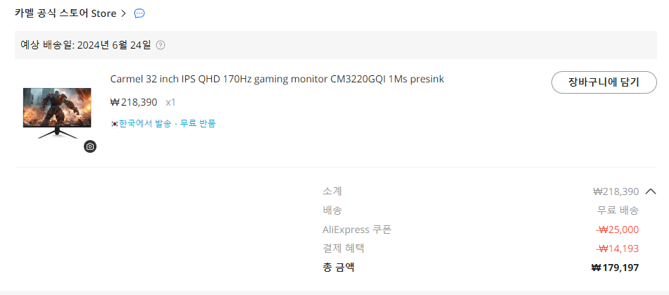 기술이 좋아져서 그런지 7년전보다 고스펙인데 가격은 더 싸졌네요. (이전에 구입한 큐닉스 QHD 27인치 모니터가 21만원)