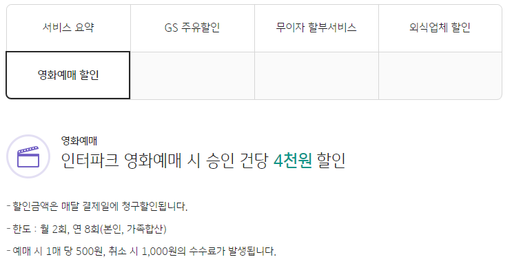 | 인터파크 영화예매 청구할인 | 건당 4천원 | 월2회, 연8회 예매 1매당 수수료 500원 부과 |