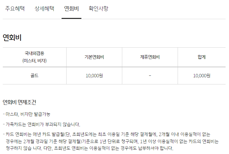 연회비는 국내외겸용(MASTER, VISA) 둘 다 1만원입니다. 국내 전용은 없습니다.