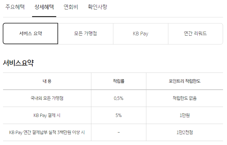 | KB Pay 결제 시 | 5.0% (최대 월 1만점) | 관리비, 세금, 해외이용 등 불가 |