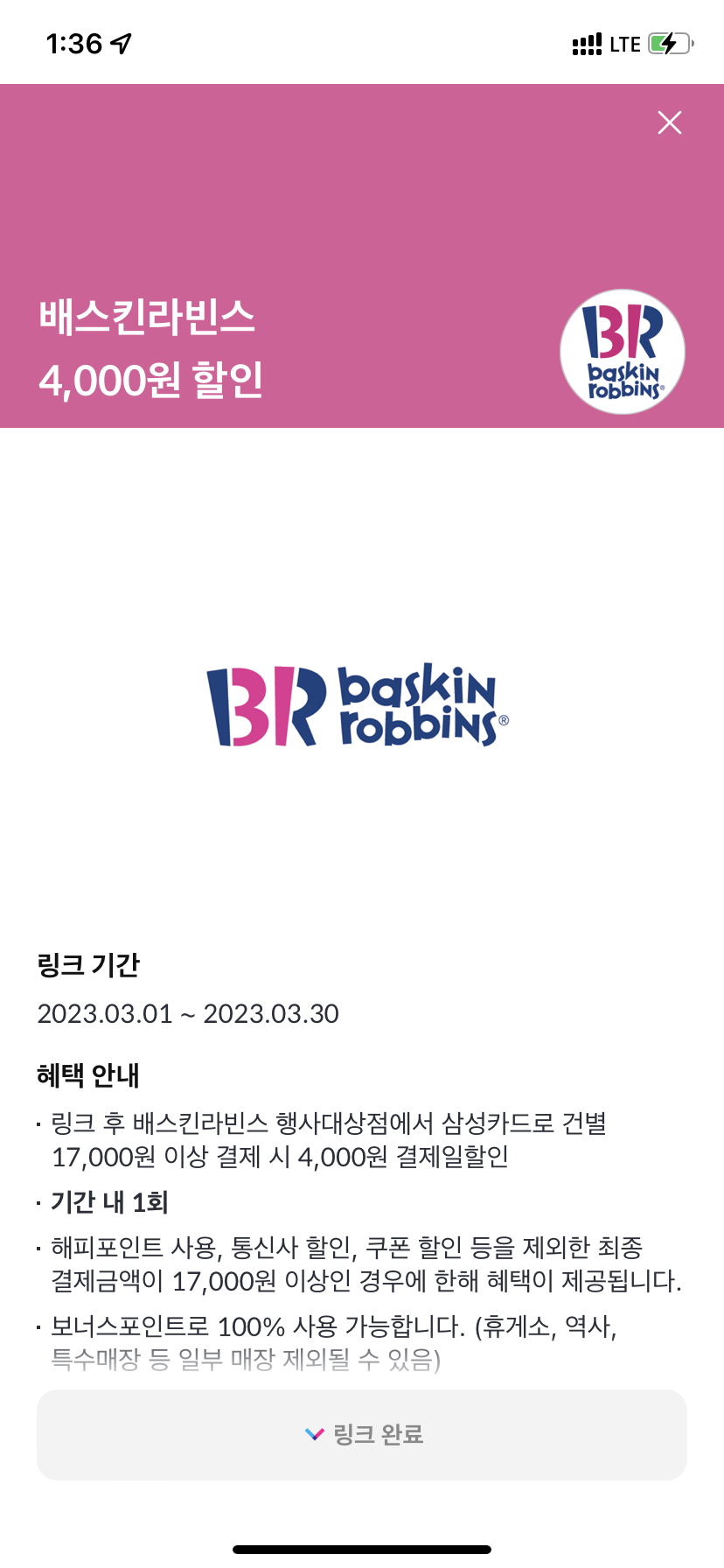 간단히 생각해보면 3월 1일부터 3월 3일까지 사이에 배스킨라빈스에서 2만원을 결제하면 5천원+4천원 해서 총 9천원의 청구할인을 받을 수 있을 것 같지만,