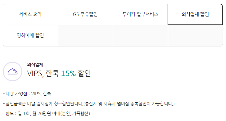 | VIPS, 한쿡 청구할인 | 15% | 일1회, 월 이용금액 20만원까지 |