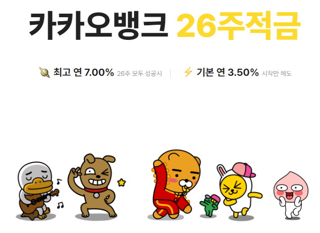 카카오뱅크에는 연 7.0%의 이자를 주는 "26주 적금" 이라는 것이 있습니다. (기본 3.5%+7주 성공시 1.0%추가+26주 성공시 2.5%추가)