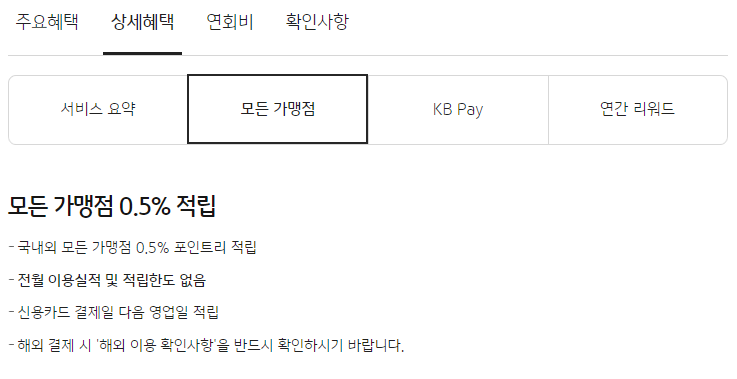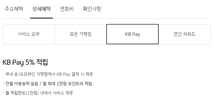 | KB Pay 결제 시 | 5.0% (최대 월 1만점) | 관리비, 세금, 해외이용 등 불가 |